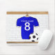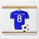 Os esportes originais projetam com um jérsei de futebol azul e branco com uma bola de futebol que pendura em um vestuário que seja inteiramente customizável com seus próprios nome e número. Um ideal personalizou o presente para todo o jogador de futebol ou fã de futebol.