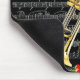 Jogue a música. - Tapete do rato. Toque trombeta contra um suporte de música com chapéu de jogador sobre. Em um fundo preto da folha de música. Ideal para todos os melómanos e músicos!