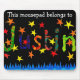 Um bocal de boa qualidade com um design de colagem de papel pintado a mão colorido e colorido dizendo "Este bocal pertence a Justin" sobre um fundo preto. Consulte também cartão de saudação e presentes correspondentes.