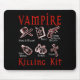 A imagem é uma ilustração estilizada de um kit de matança de vampiros. As palavras "VAMPIRE" e "KIT DE MORTE" são escritas em caracteres grandes, vermelhos e góticos, no topo e no fundo, respectivamente. No meio, há seis desenhos brancos esboçados de itens tradicionalmente usados para matar vampiros: uma estaca e um balé, uma bíblia, uma pistola com balas prateadas, uma garrafa de água sagrada, alho e uma cruz. Presente perfeito para Góticos e amantes de vampiros.