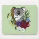 Urso coala giro num membro da árvore com flores e folhas de eucalipto em pano de fundo verde