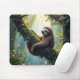 Uma preguiça é vista confortavelmente agarrando um galho coberto pela musgo enquanto rodeado por uma folhagem verde e flores vibrantes