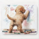 Um filhote de labradoodle brincalhão parece estar desenhando rabiscos coloridos em uma parede usando gizes espalhados no chão