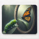Uma lagarta verde e uma borboleta monarca colorida são posicionadas nos lados opostos de um espelho oval com gotas de água na sua superfície