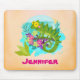 Um mouse personalizado com uma ilustração fofinha de um lagarto tropical verde cercado por folhas e flores de cor azul-turquesa.