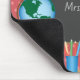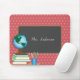 Este mouse pad da professora apresenta um gráfico da mesa de um professor acentuado com um globo, livros, maçãs e lápis. Um quadro lateral aparece em um fundo de salmão e bolinhas rosa e oferece texto personalizado para o nome do professor.