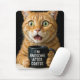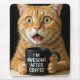 Um gato de gengibre laranja surpreso segurando uma caneca preta de café com uma mensagem engraçada.