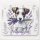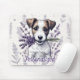 Uma encantadora ilustração feita à mão de um Jack Russell Terrier segurando um timbre de lavanda.
