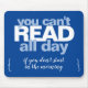 Compartilhe seu amor por ler com este divertido mouse moderno. A frase "Você não pode ler o dia todo se não começar pela manhã" em texto de tipografia na moda aparece em tons de azul e branco.