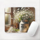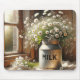 Daisy e o buquê de hálito do bebê em lata velha de metal por uma janela rústica da fazenda