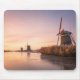 Foto do museu com uma paisagem com uma fileira de três moinhos de vento tradicionais e sementes ao longo de um rio congelado durante um colorido nascer do sol no inverno em Leidschendam, na Holanda.