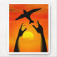 Dois braços soltando um pássaro à liberdade com um glorioso pôr do sol