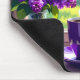 Um bonito mouse pad com uma bela ilustração de uma vibrante lilases roxas sentadas em um vaso de vidro, junto a uma xícara de vapor de café quente em um dia brilhante de verão.
