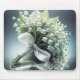 Um belo buquê de lírio das flores do vale repousa sobre um espelho e está amarrado com uma fita branca de cetim, colocada sobre um fundo suavemente iluminado