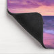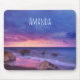 Mousepad com uma bela fotografia com cores marcantes de roxo, azul e rosa no pôr do sol. Uma bonito linha costeira espalhada por rochas.