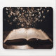 Livro aberto com letras voadoras e faíscas sobre fundo preto