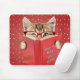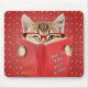 Tabby cat com óculos lendo livro vermelho sobre bolinhas branca e fundo vermelho. O padrão de fundo pode ser alterado.