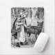Este mouse pad tem uma ilustração negra e branca de um capô de equitação vermelha e o lobo na floresta sob árvores com ela vestindo uma capa encapuzada e dando flores de lobo de sua cesta.