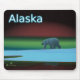 Um urso polar vagueia o gelo durante a longa noite polar; o Norte brilha em vermelho e verde à distância. A leitura de texto "Alaska" em azul e branco brilhantes também é exibida.