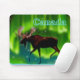 Uma imagem de um alce silenciada contra as luzes do Norte, um pouco estilizada. A leitura de texto "Canadá" aparece em azul e branco brilhantes.