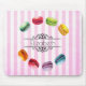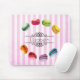 Mousepad personalizado com um rico de aquarela design de macarões franceses doces e deliciosos em formação circular. No centro está uma moldura decorativa que guarda seu nome. O texto pode ser personalizado com seu nome, nome comercial ou o que você quiser. Os macarões são pintados em muitas cores bonitas como rosa, azul, verde limão, amarelo ensolarado, vermelho, roxo etc.. Colocado sobre um padrão riscado rosa angustiado. Chic e clássico.