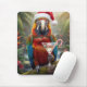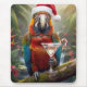 A colorful parrot wearing a Santa hat sits on a branch in a lush jungle, holding a cocktail with a candy cane garnish