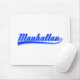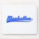 Manhattan, Nova Iorque, escrito com uma haste (cauda). Fontes em branco e azul. Design de texto original.