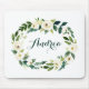 Um mousepad do tema floral Whimsical. Apresenta uma camada floral de aquarela de flores brancas e verde. Personalize adicionando um nome ou uma frase curta. Este bufo floral branco é perfeito como presente personalizado.