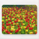 Foto atraente de tulipas vermelhas e amarelas iluminadas de trás pelo sol em Gorsedd Gardens, Cardiff, País de Gales.