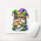A whimsical gnome, adorned in a vibrant Mardi Gras mask and jester hat, happily enjoys a slice of king cake while sporting colorful beads