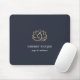 Mousepad personalizado chic para seu spa, saúde e bem-estar holístico, estúdio de yoga ou negócio de terapia de massagem apresenta duas linhas de texto personalizado em letras brancas clássicas, em um fundo azul rico e marinho adornado com um logotipo falso de flor de lotus de folha de ouro. Uma silhueta de uma pessoa meditante é sutilmente trabalhada nesta design moderna e elegante que é perfeita para marcar seu negócio de bem-estar. Personalize com seu nome ou nome comercial ou escolha o texto personalizado.