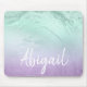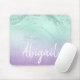 Este bonito mouse personalizado apresenta textura de mármore verde-claro da menta verde-gradiente, textura roxa e letra elegante da caligrafia. Personalize o produto com seu nome ou qualquer outro texto.