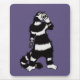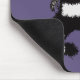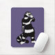 Mousepad de gato assustador com um desenho de tinta representando um estranho gatinho listrado preto e branco com pescoço longo segurando uma máscara do crânio. Parece que uma de suas luvas está fora e sua mão esquelética mostra de sua manga. Pergunto-me se é muito mais uma criatura assustadora do que finge estar no Halloween.