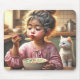Menina bonita comendo cereais de café da manhã com seu gatinho branco de estimação