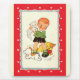 Ilustração antiga de design infantil apresentando uma linda criança loira resgatando um gatinho de dois cachorros selvagens que estão correndo em volta de suas pernas e perseguindo um ao outro. Efêmero antigo com uma borda vermelha decorativa com corações.
