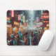 Um mercado ciberpunk lotado com vendedores robóticos, placas de neon multilíngue e pessoas vestindo visitantes de AR.