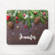 Um mouse pad com uma fotografia rústica de uma mesa marrom de madeira com pinecones, agulhas de pinheiros, neve e Enfeites de natal. Festivo e adorável.