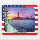 Mouse pad com sua própria foto, emoldurada por uma imagem da estátua da liberdade e da bandeira dos EUA. O texto é facultativo.