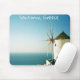 Imagem em forma de aquarela de um moinho de vento na borda da caldeira em Oia, na ilha grega de Santorini