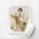 Jovem que está bem tomando uma bebida. Ela segura um pedaço de grão e flores debaixo do braço. Presentes de arte para amantes de Vintage e Nostalgia.