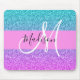Girly and glam purple, lilac, aqua e turquesa mermaid glitter brilham o nome do monograma do gradiente e o mouse pad inicial. Seu nome personalizado e monograma são escritos em um elegante roteiro escrito à mão com um fundo rosa. Um aniversário perfeito ou presente de Natal!