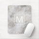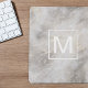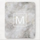 Este mouse pad apresenta um design de mármore moderno com um monograma branco em um quadro quadrado.
