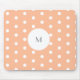 Esta moda e design bonitinha apresenta polkadots brancos contra um pastel de pêssego mole. Este mouse pad pode ser personalizado com uma inicial em uma cinza escura moderna.
