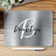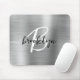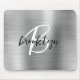 Este elegante mouse personalizado apresenta um monograma e primeiro nome em um roteiro preto e branco moderno sobre um fundo de metal embebido em prata de vidro.