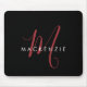 Placa do mouse moderno e elegante, preto, com script vermelho, monograma. Um monograma elegante de script vermelho combinado com uma fonte branca de san-serif limpa permite uma aparência contemporânea.
