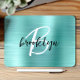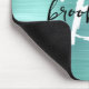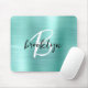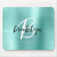 Este elegante mousepad personalizado apresenta um monograma e primeiro nome em script moderno preto e branco sobre um fundo de metal lixado aqua.