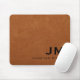 Um simples mousepad monograma apresenta um design moderno com um monograma clássico de tipografia de blocos ousado com o nome abaixo no couro marrom sável, parece um fundo texturizado.