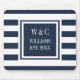 Elegante mousepad com monograma de iniciais personalizadas com um padrão listrado azul marinho e branco com suas iniciais e nome da família com a data de estabelecimento definida em um quadrado com borda azul marinho e texto branco clássico. Criado por Thisisnotme©