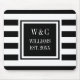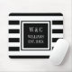 Elegante monograma personalizado de iniciais no mouse pad com um padrão listrado preto e branco com suas iniciais e nome da família com a data estabelecida definida em um quadrado com borda preta e texto branco clássico. Criado por Thisisnotme©