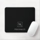 Um mousepad preto e branco profissional com um monograma quadrado moderno simples e um modelo a personalizar com um nome.
